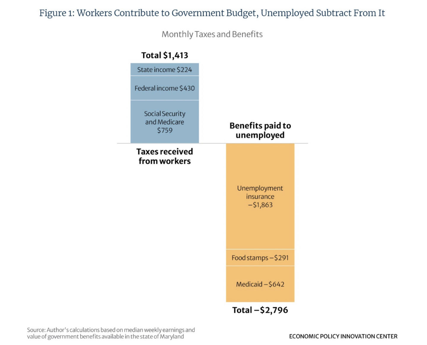 Second, individuals who are not working often receive government transfers, meaning welfare payments. A single, unemployed worker can receive roughly $2,800 per month in unemployment insurance, food stamps (SNAP), and Medicaid benefits alone. Combined, the loss of work-related tax revenues plus the cost of welfare benefits equals just over $4,200 per month.