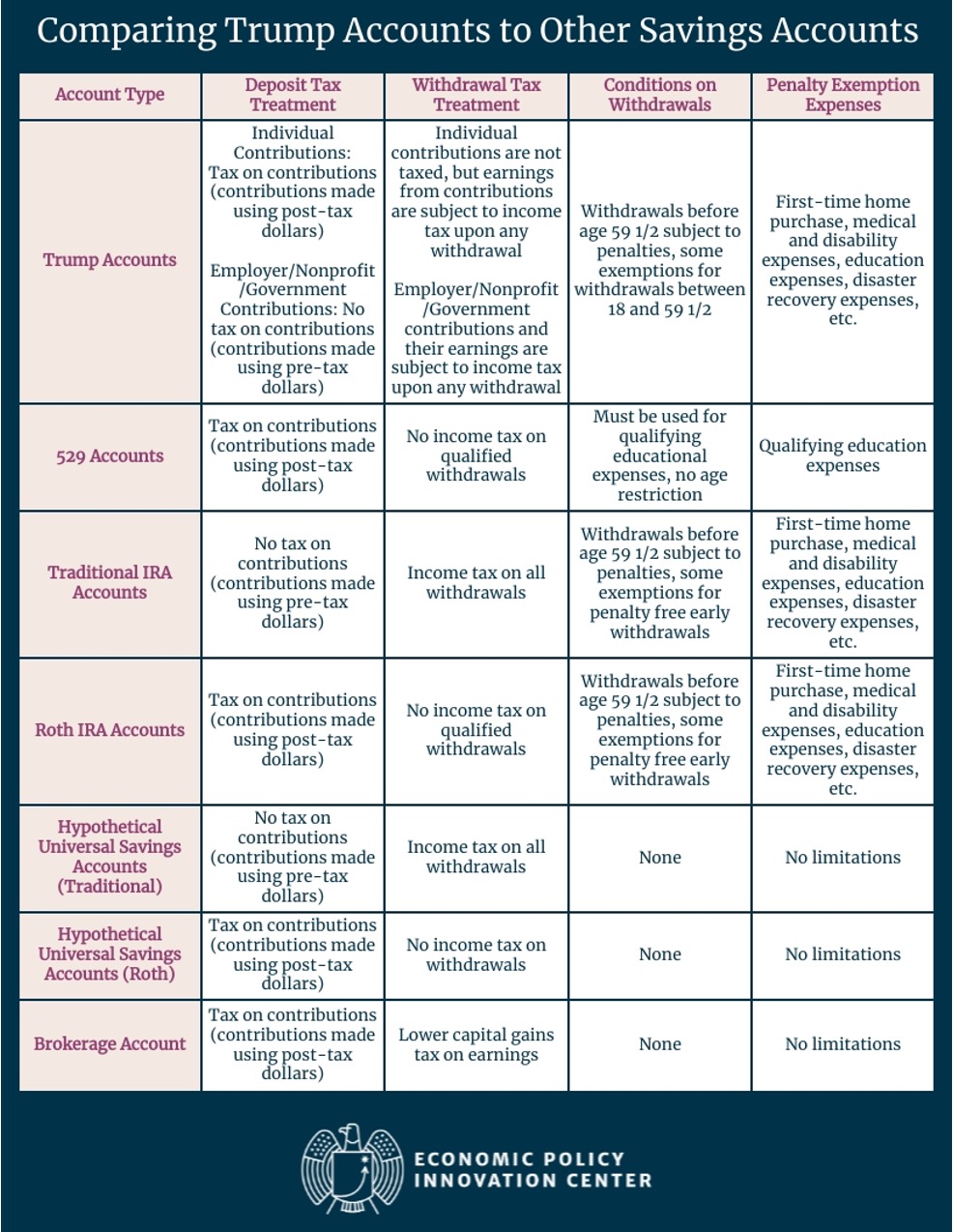 Trump Accounts are effectively a combination of a traditional IRA, a ROTH IRA, and an interest-bearing savings account.
