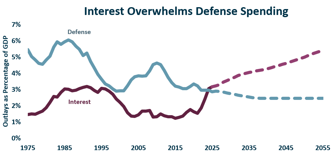 Historian Niall Ferguson coined “Ferguson’s Law” regarding the tendency of “great power” nations to decline when interest spending surpasses defense. Heavy debt service costs produce strains on both the federal budget and the economy, leading to reduced state capacity for core responsibilities and weak economic growth.