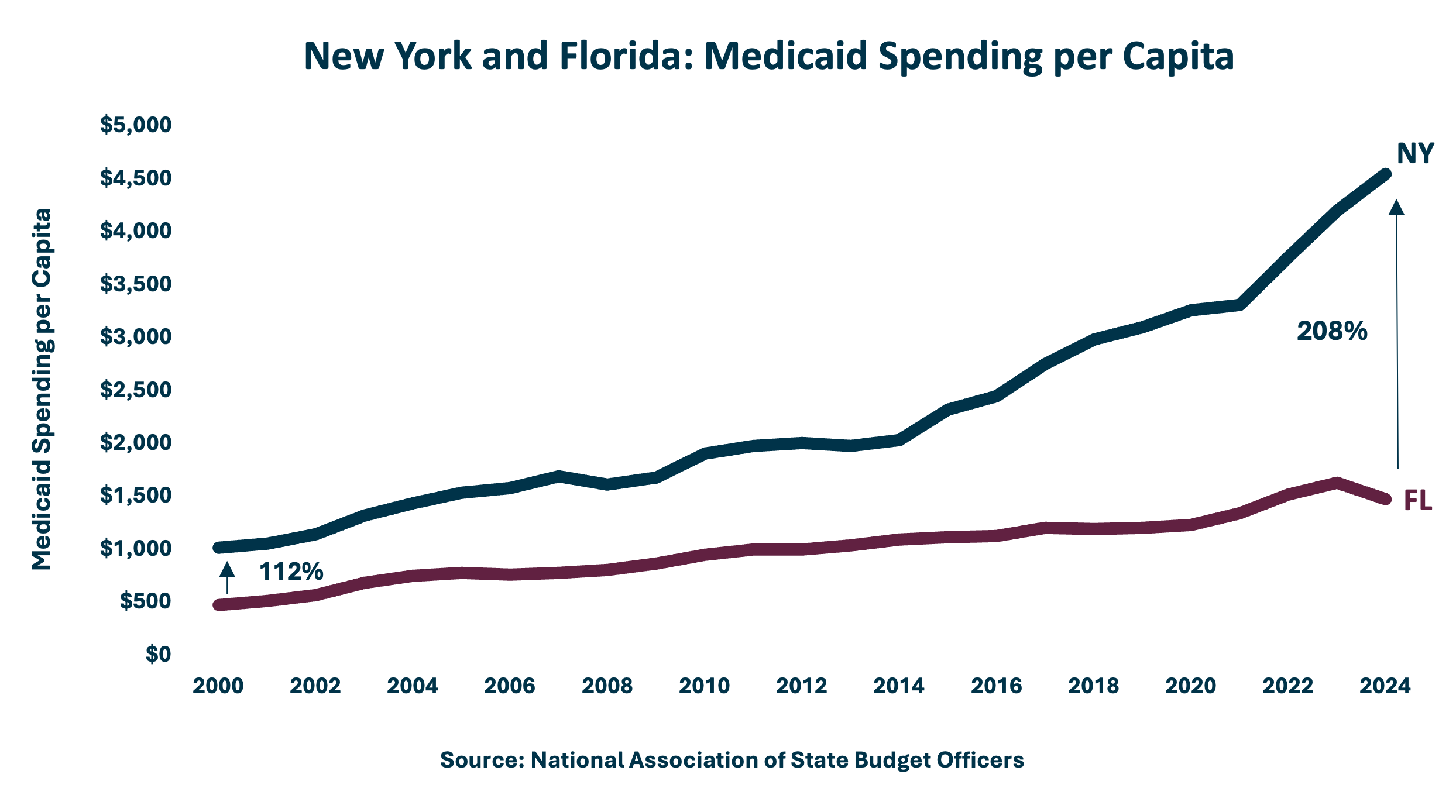 This is the largest reason why New York’s Medicaid spending per capita has grown much more rapidly than Florida’s. For perspective, in 2024 New York spent nearly as much per capita on Medicaid ($4,551) as Florida did for its entire state budget ($5,076). New York’s Medicaid spending per capita is more than three times Florida’s.