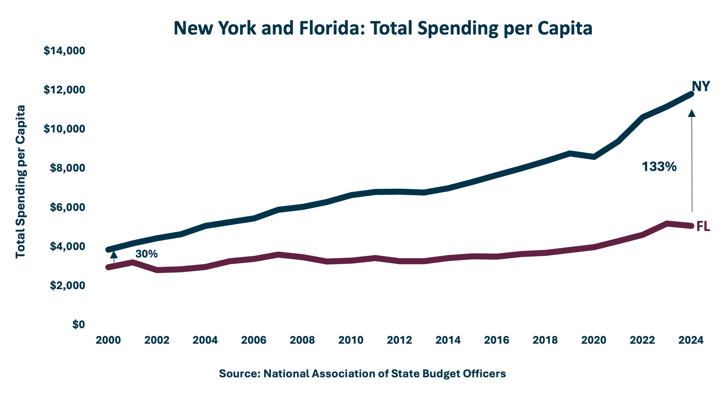 In 2000, New York State spending per capita was already 30% higher than Florida. By 2024, New York spent 133% more per capita than Florida.