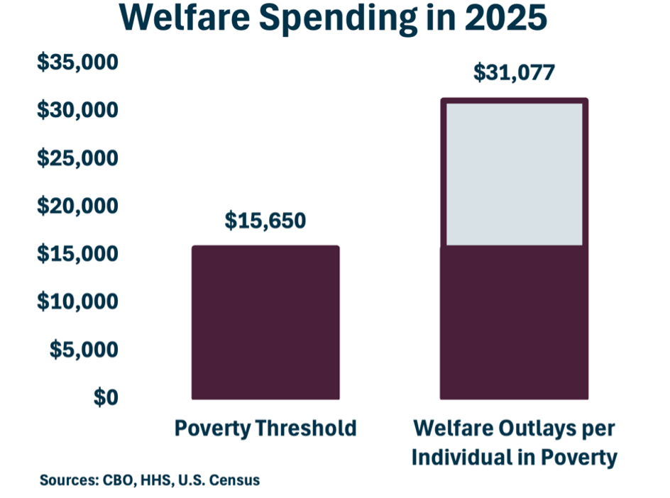 In Fiscal Year (FY) 2025, the U.S. federal government is projected to spend over $1.2 trillion on welfare programs, according to the Congressional Budget Office (CBO). This amounts to $31,077 per impoverished person.