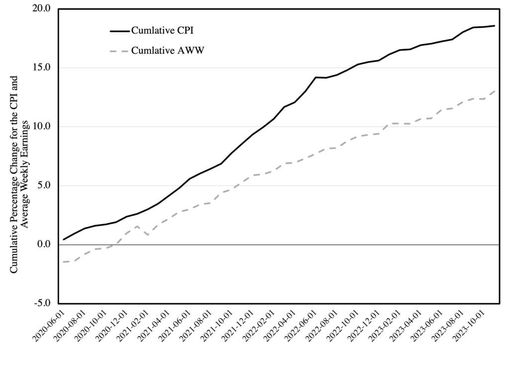 Many looking for good economic news point to those falling monthly rates, but households look at their total budgets, which have lost purchasing power even with slower CPI-U growth. This figure (which includes the latest data from December, 2023) shows the cumulative growth in both statistics. Note how much higher the general price level is relative to the level of change in average wages. This yawning gap between the cumulative growth in prices and average weekly earnings is the family budget crunch.